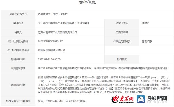 【摘要】大众网·海报新闻记者 蒋甜 青岛报道 近日,青城住建罚〔2022〕3004号公示了关于江苏中南建筑产业集团有限责任公司的案件,案件显示:主要违法事实为施工总承包单位施工现场有多台
